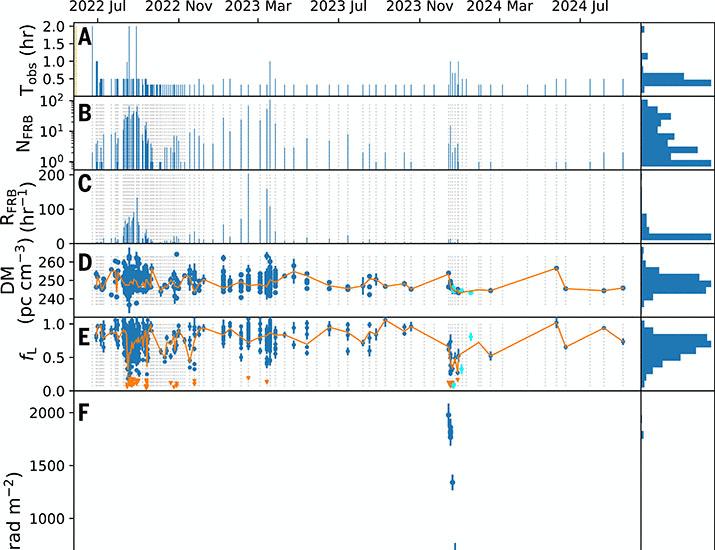 Fast radio bursts (FRBs) are millisecond-duration radio transients from extragalactic sources. Some repeating FRBs exhibit variations in their Faraday rotation measure (RM) due to changes in their magneto-ionic environment. We report magneto-ionic ...