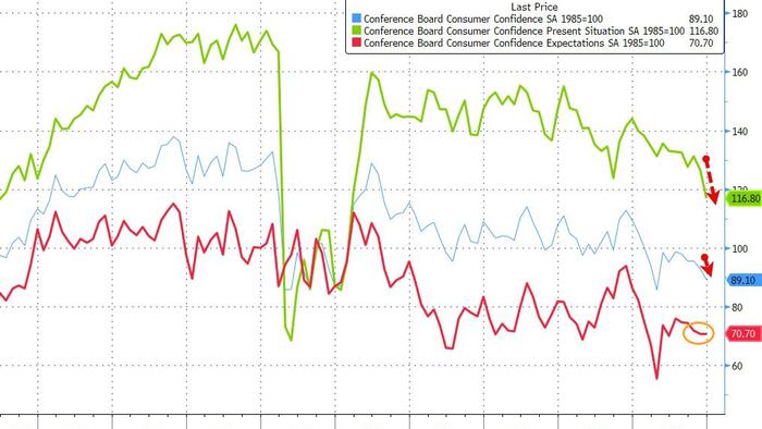 Boomers & Gen X Send Conference Board Consumer Confidence Tumbling In December Amid a flurry of disappointing soft survey data since the government shutdown, The Conference Board's Consumer Confidence data for December was a mixed bag with the Present Situation tumbling (from 126.3 to 116.8) while Expectations were flat to a dramatically upward-revised November print (from 63.2 to 70.7), dragging the overall headline index down more than expected... Source: Bloomberg “ Despite an upward revision in November related to the end of the shutdown, consumer confidence fell again in December and remained well below this year’s January peak. Four of five components of the overall index fell, while one was at a level signaling notable weakness,” said Dana M Peterson, Chief Economist, The Conference Board . "The Present Situation Index declined as net views on current business conditions were negative for the first time since September 2024, a month that included a labor market scare and deadly hurricanes." How do you 'revise' historical sentiment numbers? Under the hood, The Conference Board survey shows the trend of a weaker labor market continued to accelerate ... Source: Bloomberg Inflation Expectations were flat (but remain elevated)... Source: Bloomberg Among demographic groups, on a six-month moving average basis, confidence dipped among all age groups in December, although consumers under 35 continued to be more confident than consumers age 35 and older. There were few generational differences, as confidence among all generations trended downward in the month, with only the Silent Generation becoming more hopeful. Millennials and Gen Z remained the most optimistic of all generations surveyed. By income, confidence on a six-month moving average basis fell for nearly all brackets, except for those earning less than $15K and more than $125K. Still, consumers earning less than $15K remained the least optimistic among all income groups. Confidence continued to fall in December among all political affiliations (Democrats, Republicans, and Independents). Peterson added: “ Consumers’ write-in responses on factors affecting the economy continued to be led by references to prices and inflation, tariffs and trade, and politics. However, December saw increases in mentions of immigration, war, and topics related to personal finances-including interest rates, taxes and income, banks, and insurance. The responses continued to skew pessimistic but less so than November, potentially due to fewer negative comments about prices and inflation, politics, as well as a rebound in positive responses about interest rates . Notably, the Federal Reserve Board cut monetary policy rates on December 10 for a third time in 2025, which landed in the second half of the survey sample interval.” On net, consumers’ views of their Family’s Current Financial Situation collapsed into negative territory for the first time in nearly four years. However, expectations for their Family’s Future Financial Situation were the most positive since January of this year. So, the stock market soars near record highs, GDP is ripping, but consumer sentiment is collapsing?