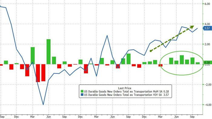 Core Durable Goods Orders Rise For 7th Straight Month While admittedly extremely lagging, the preliminary OCTOBER durable goods orders print was a big disappointment after a rebound in the summer with the headline falling 2.2% MoM (far worse than the 1.5% MoM decline expected). However, while this disappointment dragged down the YoY growth to 4.7%, it was still well above inflation... Source: Bloomberg Core Orders (ex Transports) rose 0.2% MoM (notably slower than the 0.7% MoM in September and below the +0.3% MoM expected)... Source: Bloomberg That was the 7th straight monthly gain and lifted core durable goods orders up 3.57% YoY, near the highest since Nov 2022. Finally, core capex remains solid with new orders ex-air up 0.5% (4th straight monthly gain) and shipments continue to significantly stronger than expected.
