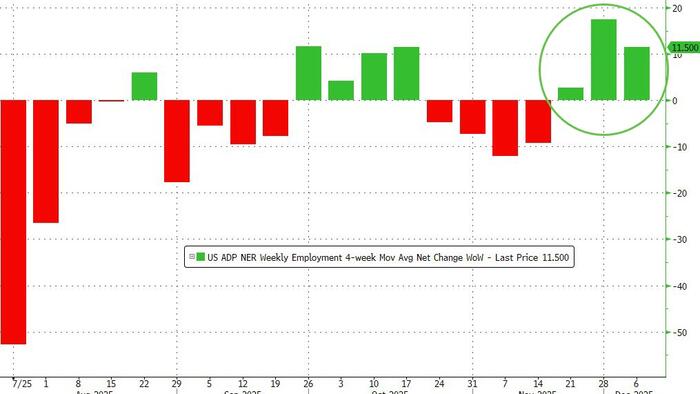 ADP Weekly Employment Data Shows Labor Market Rebounding In December Since the start of the government shutdown, what labor market data indications we got actually surprised to the upside (while soft survey data crashed)... ...but now, as the data starts to re-emerge from its slumber, it remains mixed with jobless claims data remaining solid to say the least while JOLTS leaves questions about the low-hire, low-fire, low-quits economy. If one data set has bee noisy through the past few weeks, it's ADP (and its new weekly updated prints). Analysts expected a 16.25k average job gain per week over the past four weeks... but the print was just +11.5k (46k on a monthly basis) for the week-ending Dec 6th, with the prior week's average revised up strongly to +17.5k (+70k monthly). Source: Bloomberg That is the third straight week of month-over-month gains for the labor market after a brief slump as the government shutdown started.